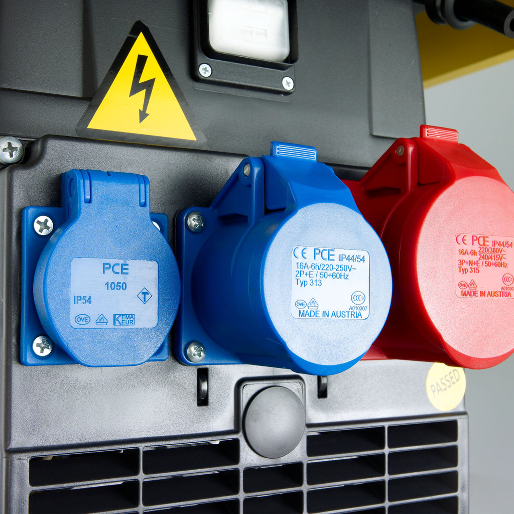 Gniazda podłączeniowe: 1 x 230 V / 16 A 1~ CEE 7/3, 1 x 230 V / 16 A CEE 3 P, 1 x 400 V / 16 A CEE 4 P