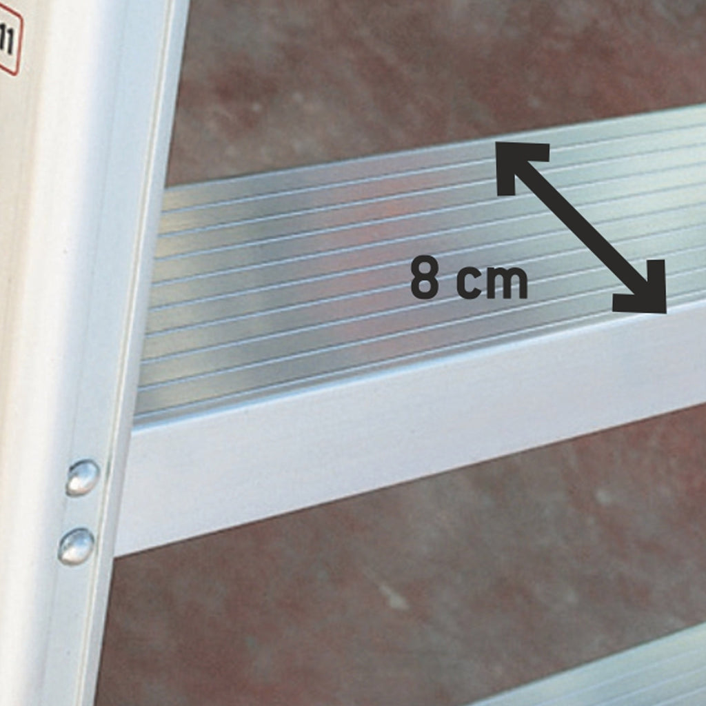 Po złożeniu drabina zajmuje niewiele miejsca, co zapewnia łatwy transport i przechowywanie. Użycie wysokiej jakości aluminium sprawia, że drabina jest zarówno lekka i wytrzymała, a także odporna na korozję. Wytrzymałe stopnie o szerokości 8 cm montowane z podłużnicami w technologii lotniczej pozwalają na bezpieczną pracę na wysokości, a antypoślizgowe stopki zapobiegają przesuwaniu się drabiny w trakcie jej użytkowania. Dzięki zastosowaniu wzmocnień w narożnikach oraz krzyża stabilizującego w tylnej części drabiny, produkt zyskał dodatkową stabilność.