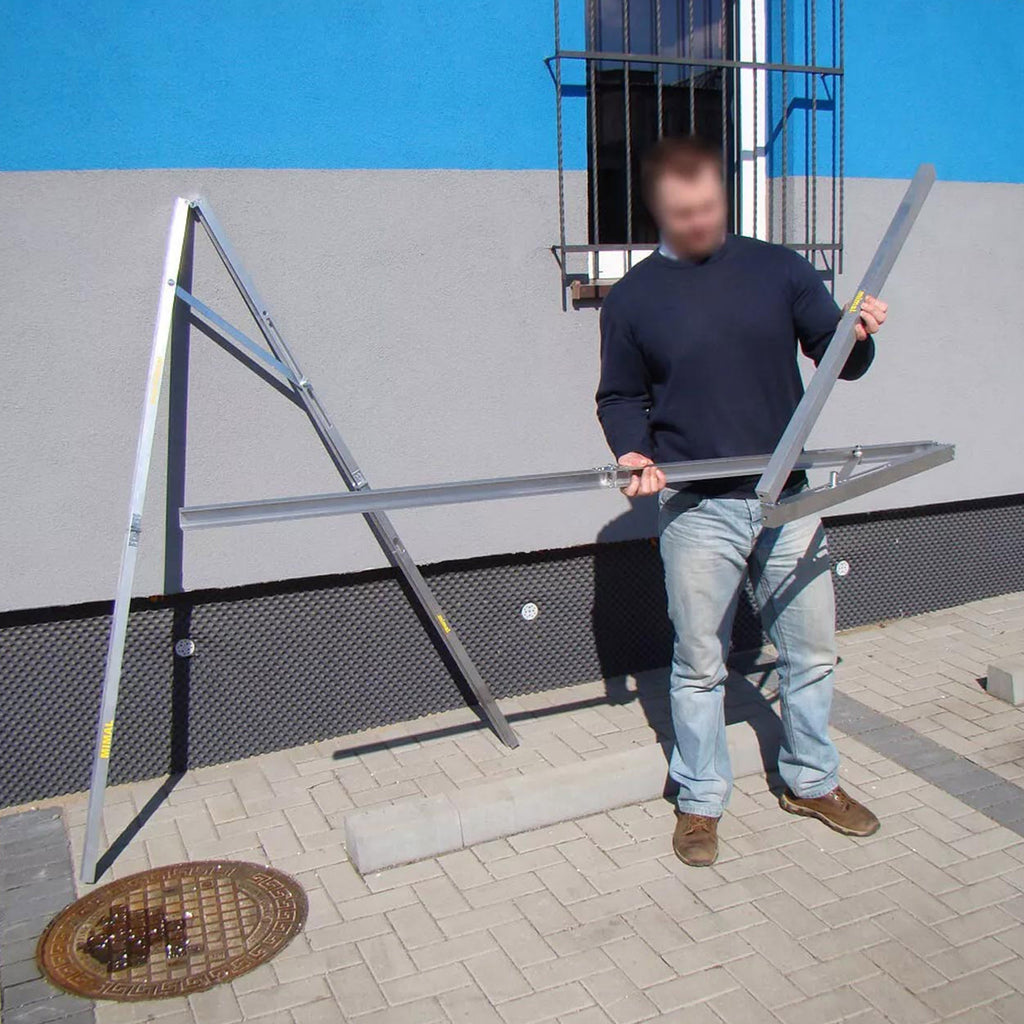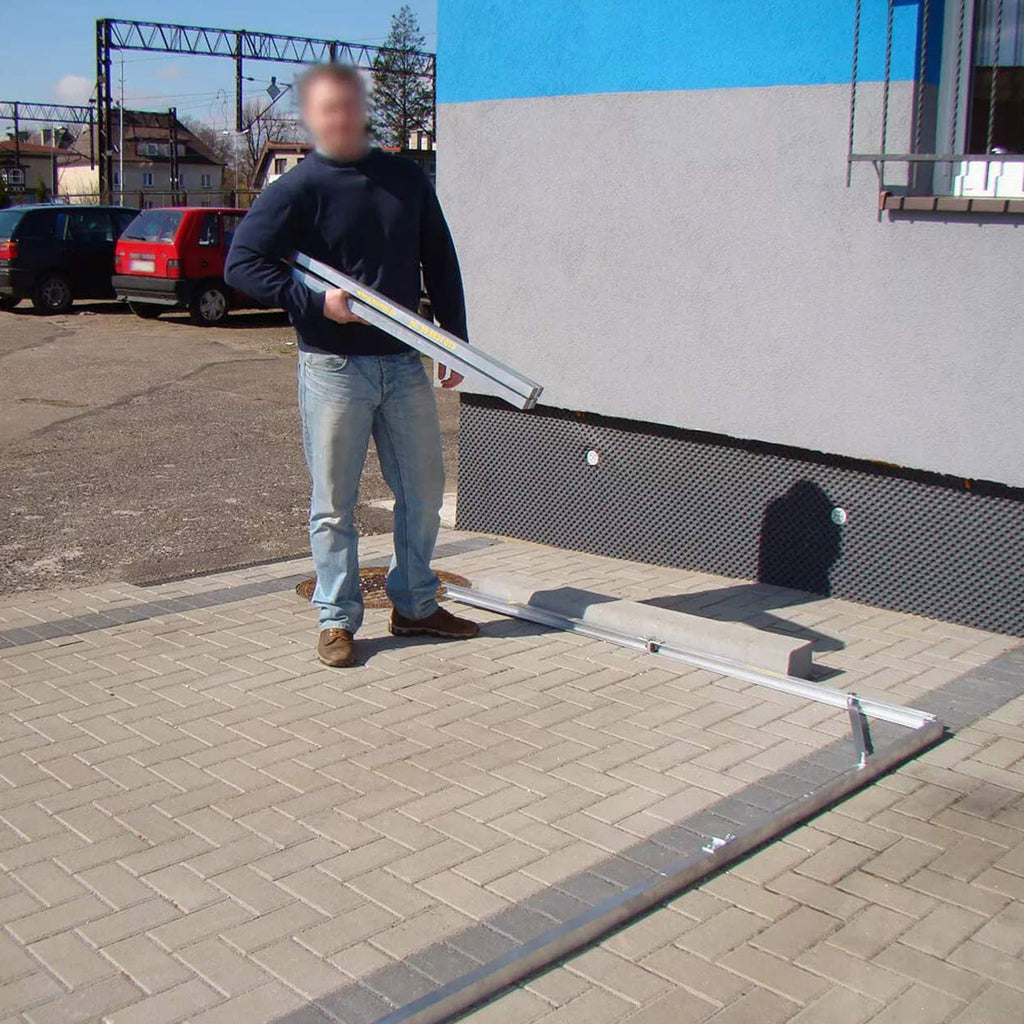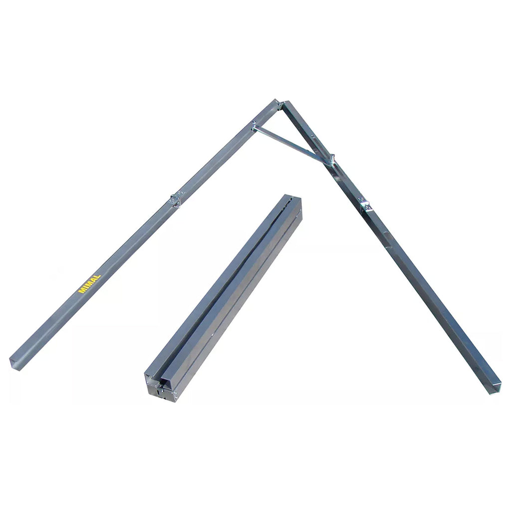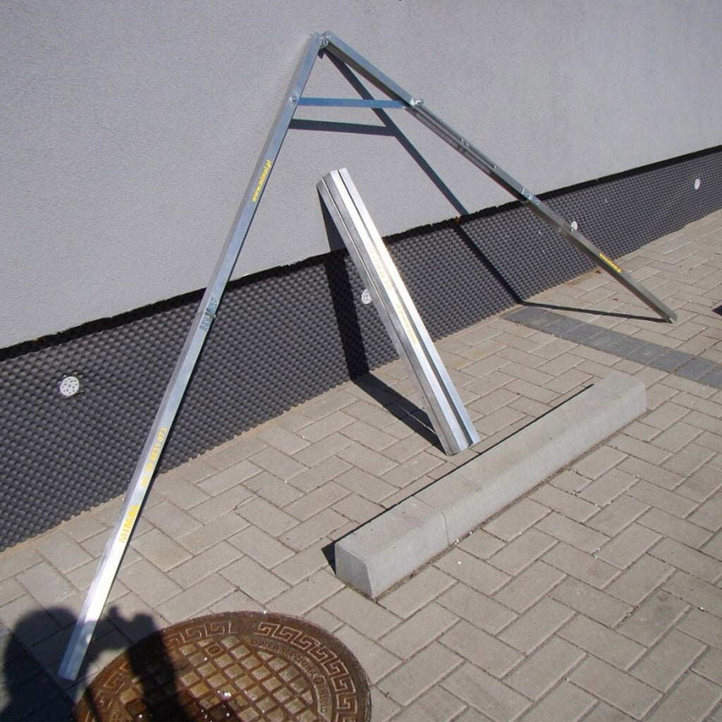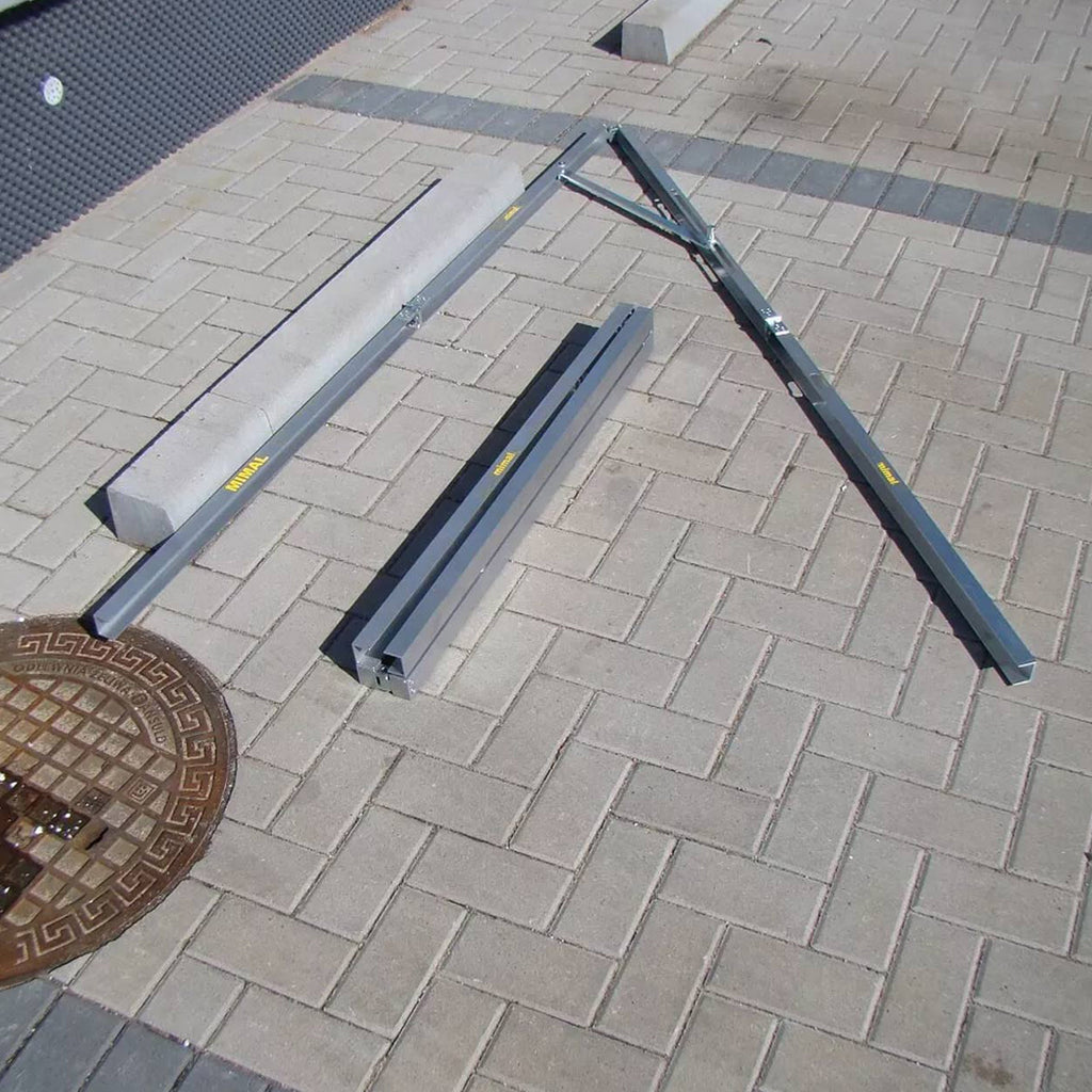 Kątownik Mimal KKB to przyrząd do sprawdzania kąta. Sprawdza się przy układaniu kostki brukowej, bądź innych pracach gdzie wymagane jest zachowanie odpowiednich paramentrów. Urządzenie jest aluminiowe, co zapewnia mu niewielką wagę 4,2 kg przy długości 2000 mm. Kątownik posiada składane ramiona i w tej pozycji ma długość 1000 mm, co bardzo ułatwia jego transport. Stała regulacja kąta wynosi 45° i 90°.