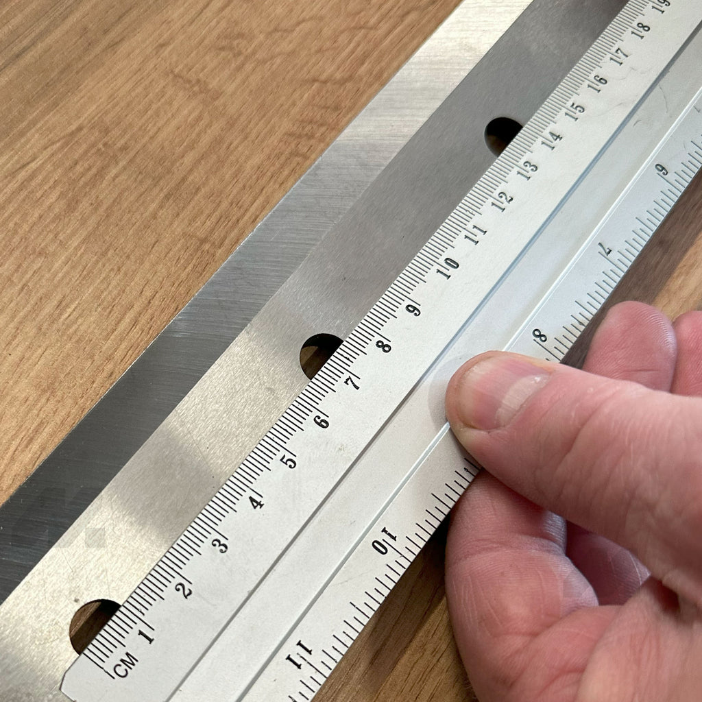 Komplet długich noży do rębaków. Rozstaw między otworami wynosi ok. 6.5 cm.
