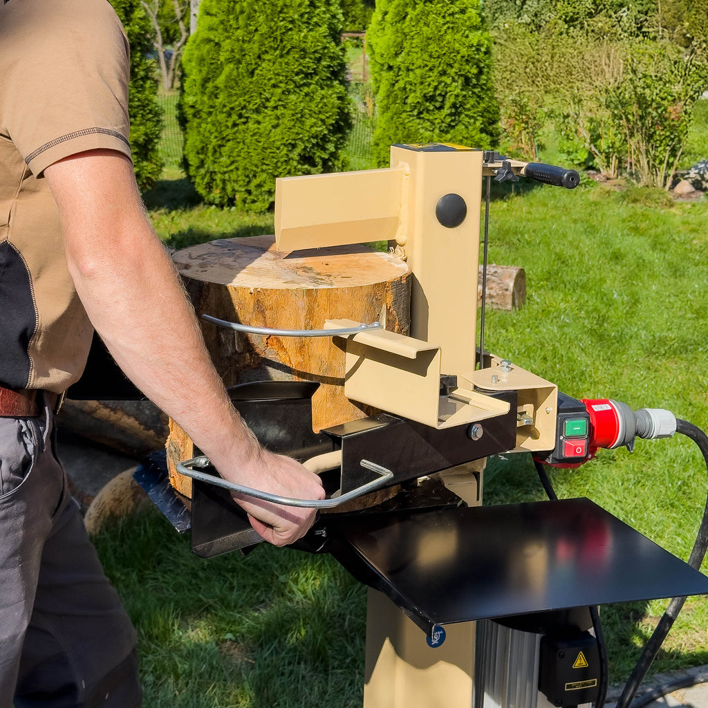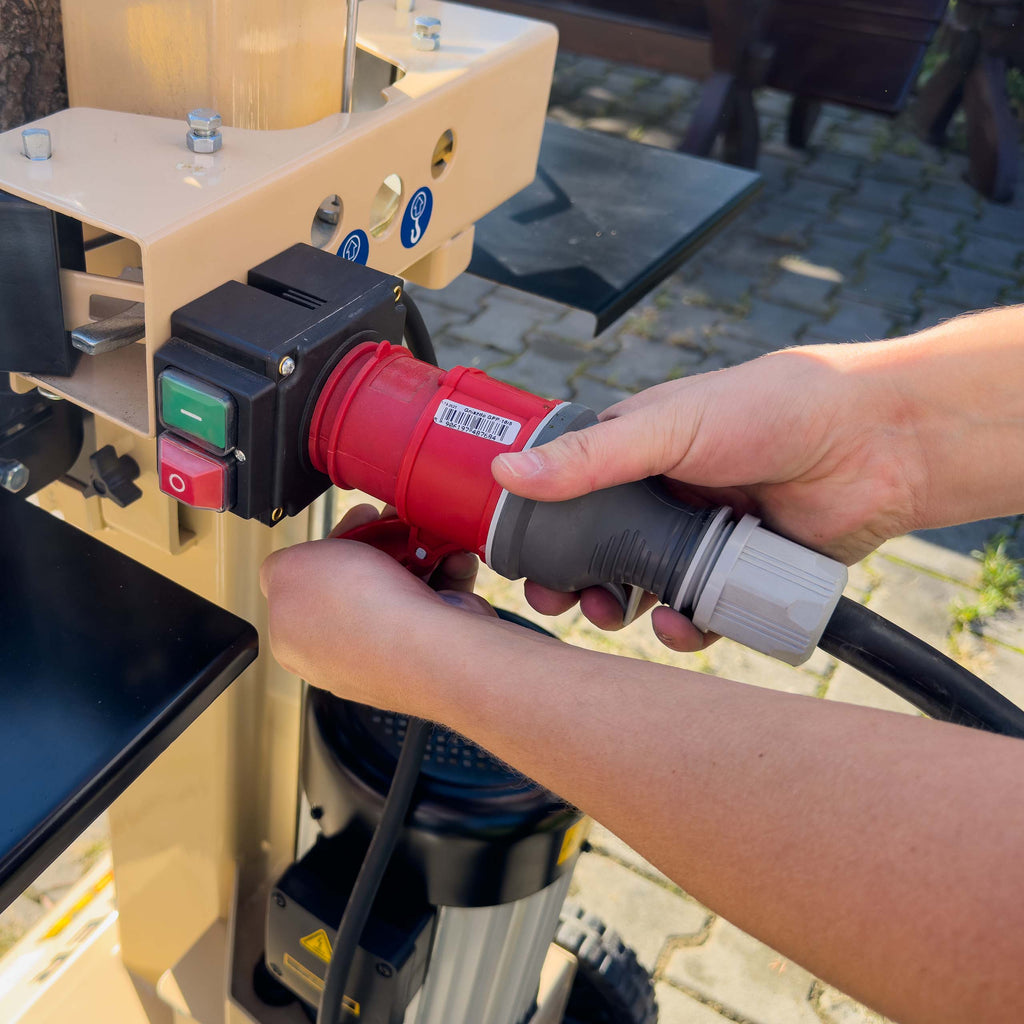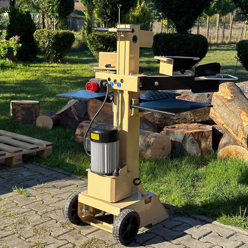 Urządzenie obsługuje polana o średnicy Ø 8–40 cm i długości 10–55 cm, a dzięki szybkiemu cyklowi roboczemu (6 cm/s posuw, 19,4 cm/s powrót) minimalizuje czas przestoju, zwiększając wydajność w sezonie grzewczym. Zasilanie 400 V gwarantuje stabilną pracę nawet przy długotrwałym obciążeniu, co docenią firmy działające w trybie zmianowym.