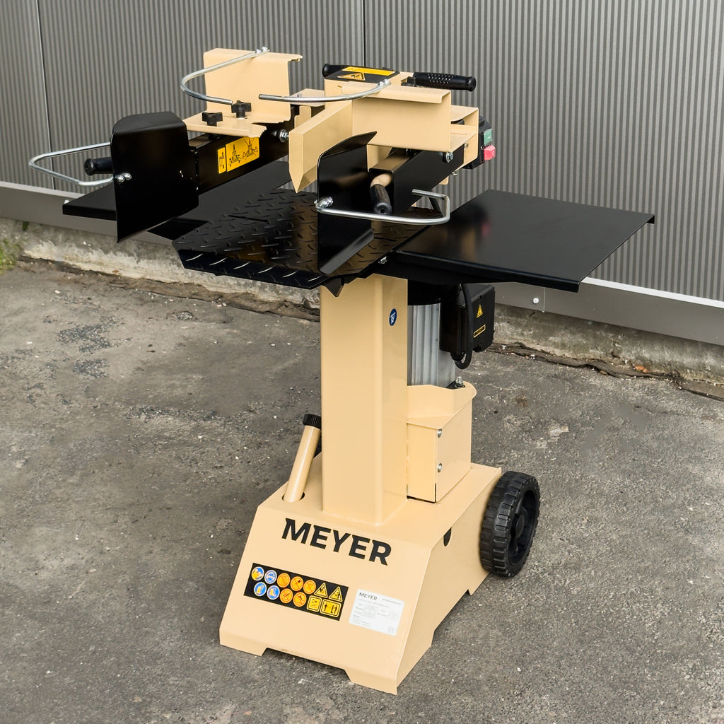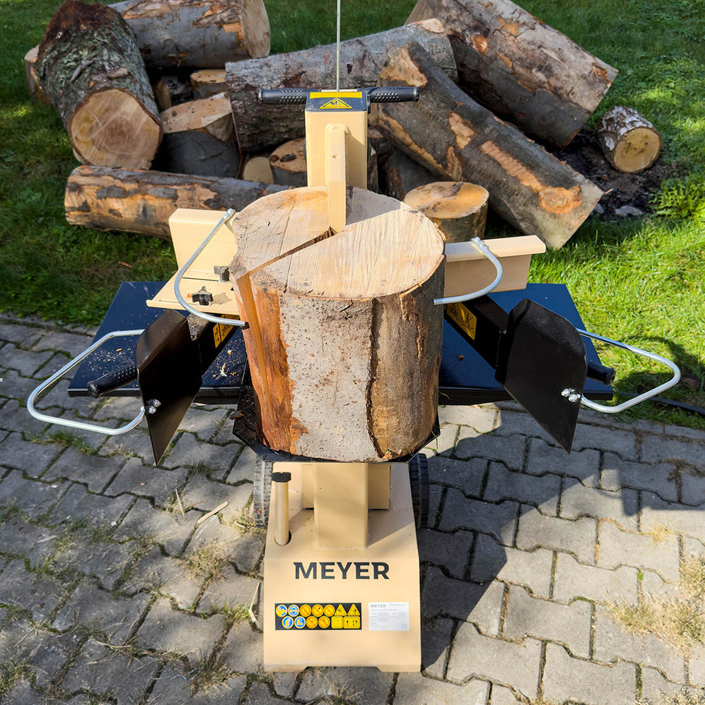 Łuparka MEYER M8TN 400V to profesjonalne urządzenie do intensywnego przerobu drewna opałowego w firmach usługowych, składach opału i większych gospodarstwach. Wyposażona w silnik 3,5 kW i układ hydrauliczny o ciśnieniu 21 MPa, generuje 8 ton siły rozłupywania, co pozwala efektywnie pracować zarówno z drewnem liściastym (buk, dąb), jak i iglastym.