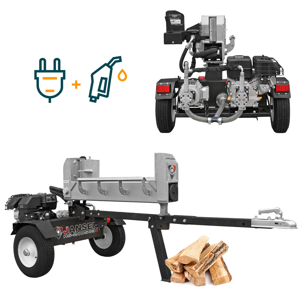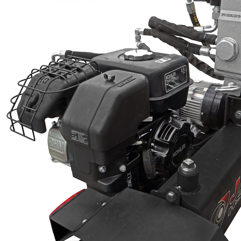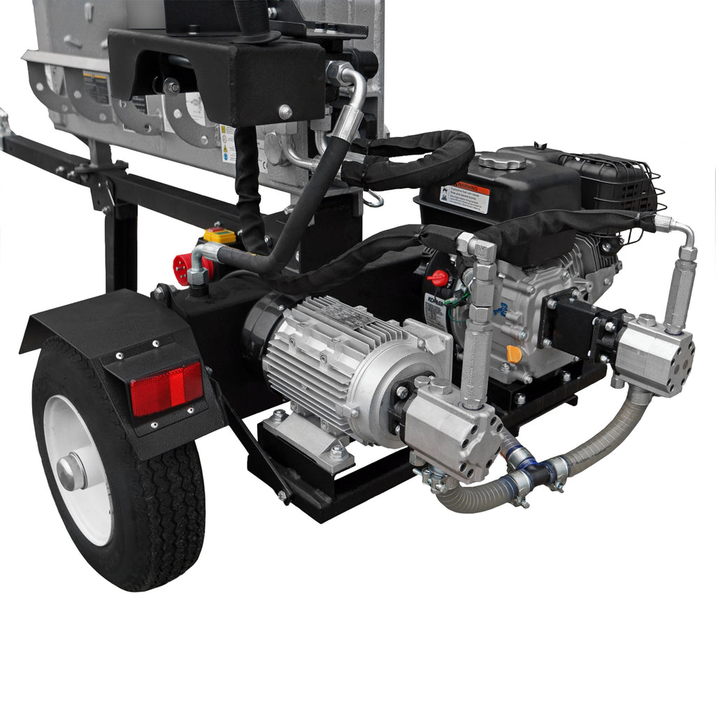 HS-20DS63K to łuparka hybrydowa - posiada niezbędne komponenty zarówno do pracy w trybie benzynowym, jak i elektrycznym. Pompa hydrauliczna może być zasilana silnikiem benzynowym Kohler 6.5 KM. Można go bardzo łatwo uruchomić za pomocą rozrusznika linkowego. Do pracy na silniku elektrycznym (400V, 2.2 kW) potrzeba odpowiedniego kabla oraz podłączenia do zasilania.