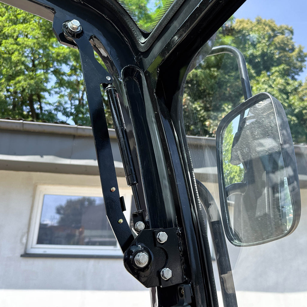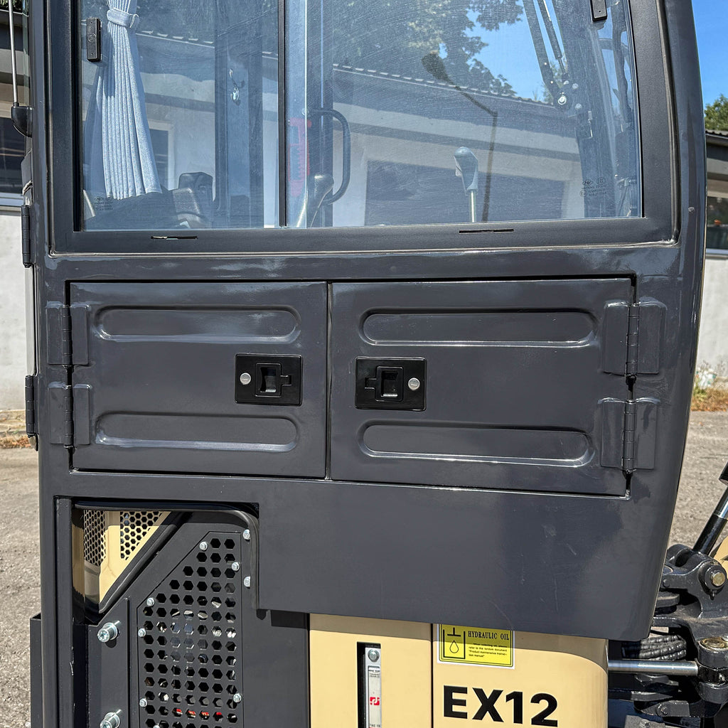 Koparka 1,2 tony z kabiną zapewnia jeszcze lepszy komfort pracy operatorowi. Kabina została wyposażona w wentylator oraz otwieraną przednią szybę, co zdecydowanie wpływa na wygodę. Dodatkowa wycieraczka zapewnia doskonałą widoczność w każdych warunkach atmosferycznych.