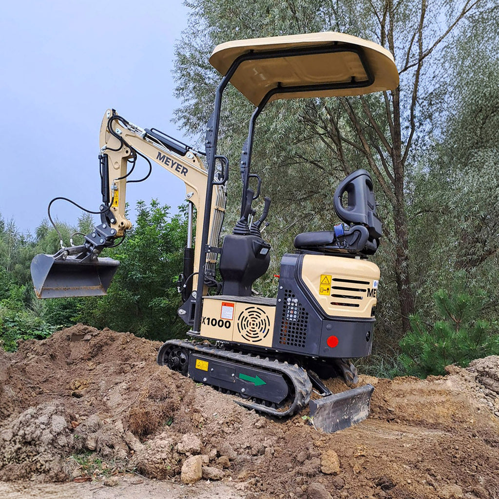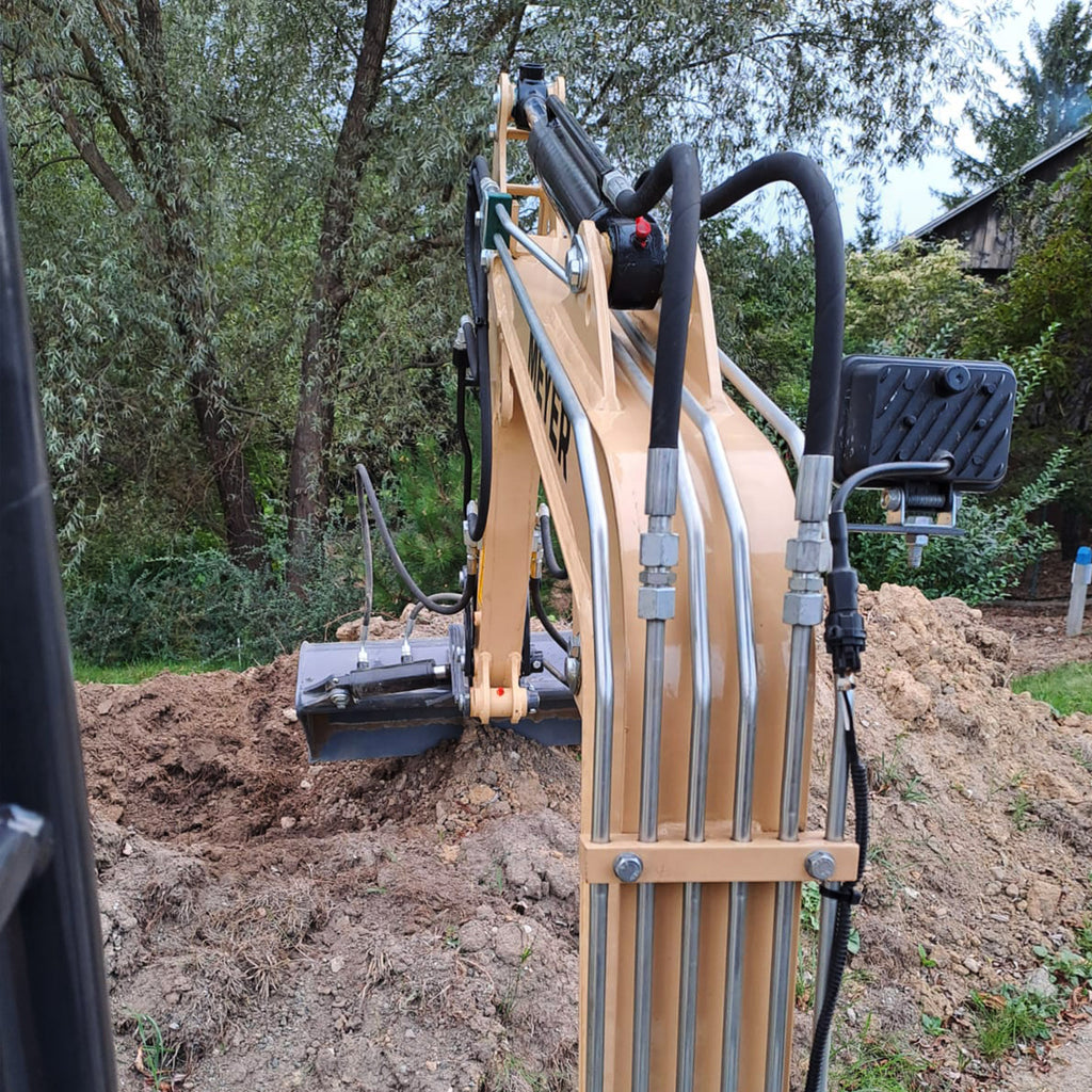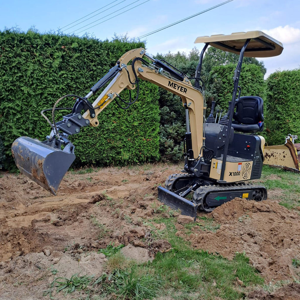 Minikoparka MEYER X1000 może być wyposażona w różnorodne osprzęty robocze, takie jak szybkozłącze, chwytak do drewna, zrywacz, łyżka wyrównująca, świder i wąska łyżka, a także opcjonalnie dach, chłodnica i inne - możliwości jest wiele, co umożliwia dostosować maksymalnie dostosować ją do Twoich potrzeb.