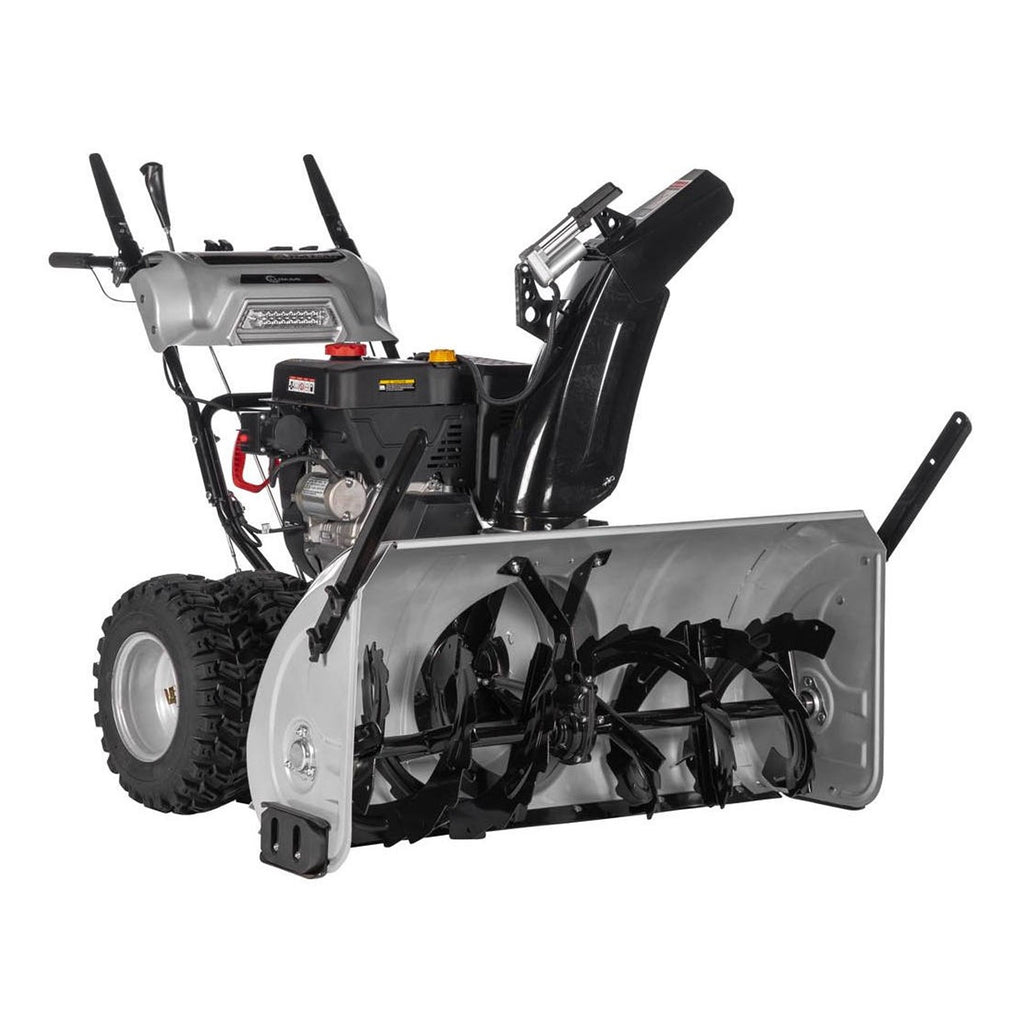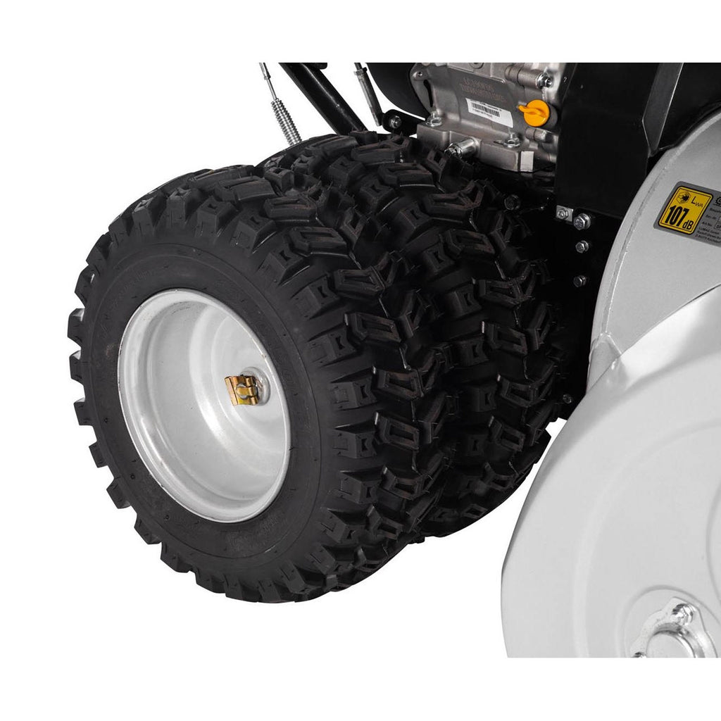 Szerokość odśnieżania to 108 cm. Rozdrobniony śnieg wyrzucany jest na odległość do 15 metrów. Kierunek wyrzutu ustawiany jest elektrycznie (regulacja przełącznikami w pionie i poziomie). Łatwe i płynne prowadzenie odśnieżarki nawet w najcięższych warunkach pogodowych zapewnia specjalny zimowy bieżnik opon, napęd własny i regulowane płozy boczne. Dodatkowo urządzenie wyposażone jest w oświetlenie LED umożliwiające pracę po zmroku. Wygodne uchwyty ułatwiają prowadzenie, a dodatkowy komfort zapewnia funkcja podgrzewania, co sprawdza się szczególnie przy bardzo niskich temperaturach.