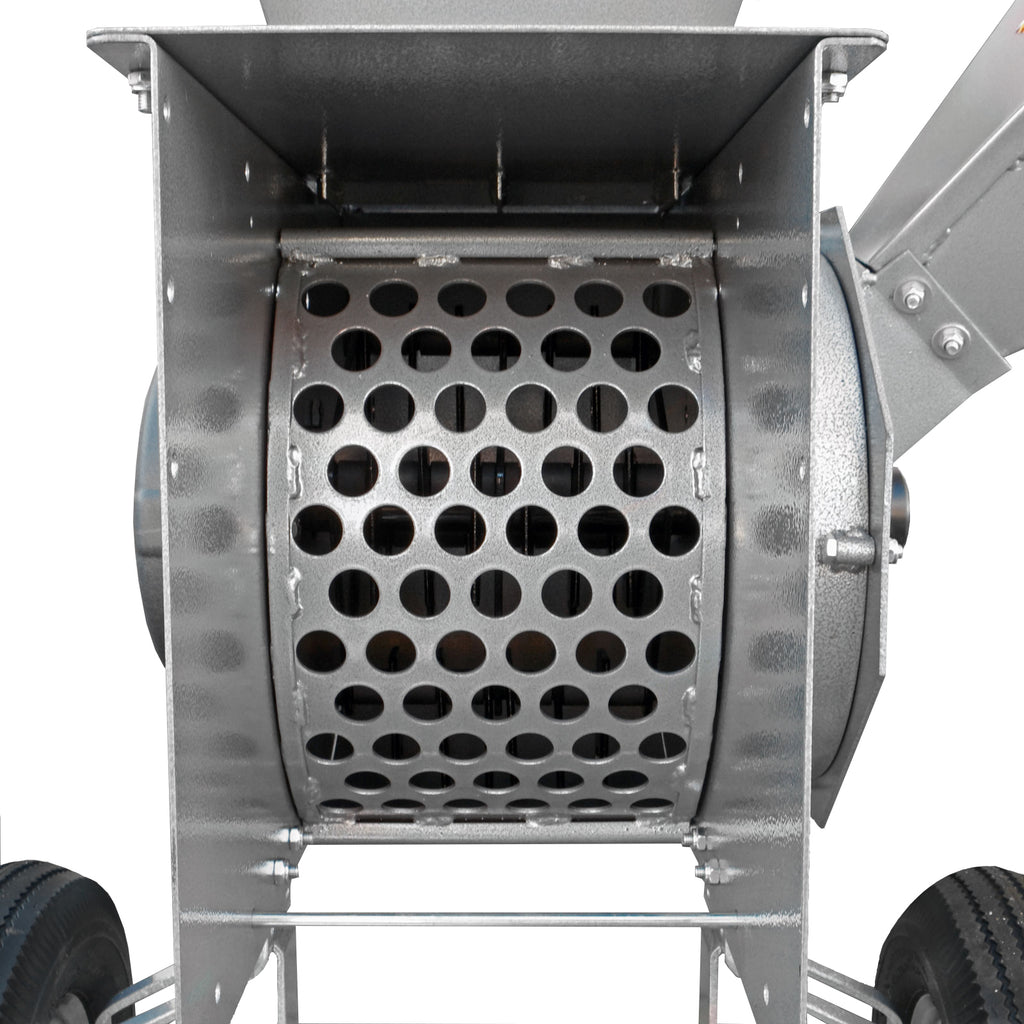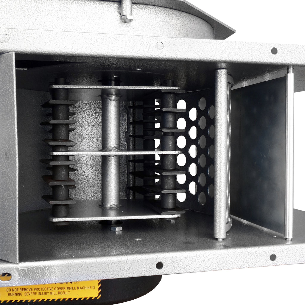 Rębak ogrodowy tnie materiał na bardzo małe kawałki, niezależnie od tego czy jest więcej gałęzi czy krzaków. Lejek boczny nadaje do grubych gałęzi o do 9 cm. Natomiast górny, duży zasobnik nadaje się do rozdrabniania bardziej krzaczastego materiału o grubości do 3-4 cm. Działanie jest niemal w pełni automatyczne. Efektywność pracy zapewniają specjalne 24 hartowane noże młotkowe. Zamontowane są na 4 obrotowych osiach i są szlifowane poprzecznie w kształcie ostrza.