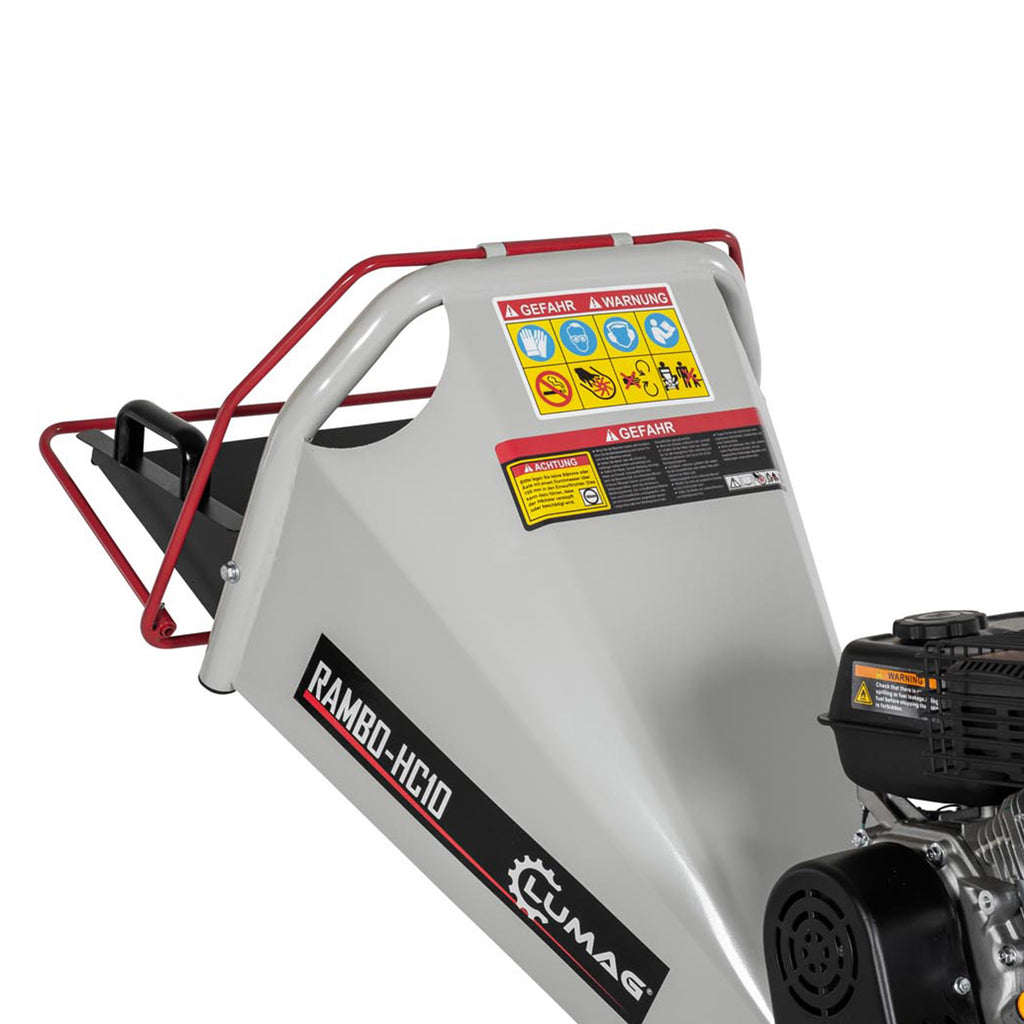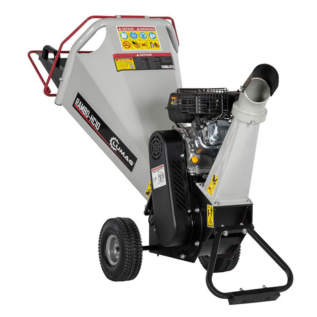 Rębak ogrodowy Lumag Rambo-HC10 rozdrabnia gałęzie i patyki o grubości do 100 mm. Napędzany jest 4-suwowym silnikiem benzynowym o mocy 6,5 KM. Głowica rębaka wyposażona jest w dwa noże tnące napędzane przez dwa pasy klinowe. Rozdrobniony materiał wyrzucany jest przy pomocy siły odśrodkowej przez lej wyrzutowy. Gałęzie wciągane są automatycznie - nie trzeba ich popychać - wpływa na to odpowiedni kąt cięcia noży i budowa leja wsadowego.