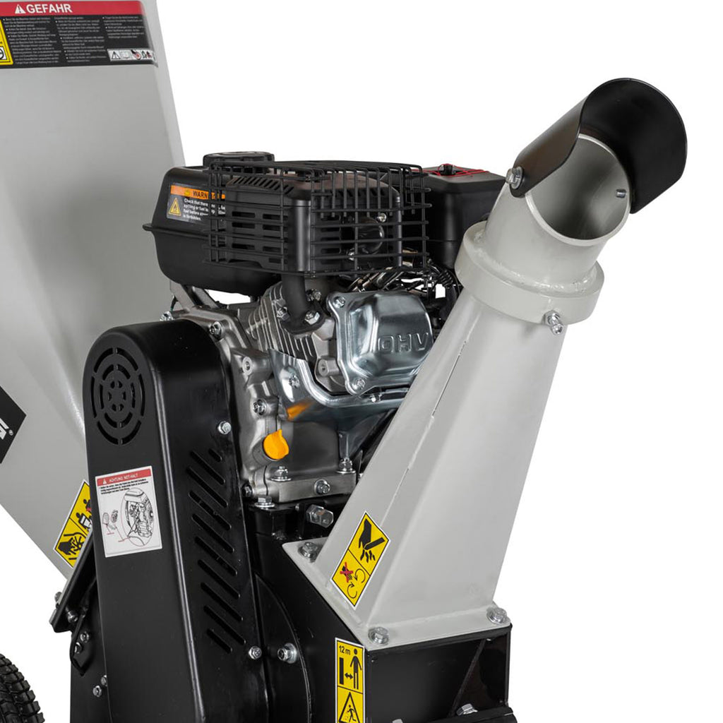 Wysoko usytuowany lej wylotowy posiada regulację kierunku wyrzutu rozdrobnionych materiałów. Z łatwością można ustawić go tak, by skierować materiał prosto do taczki, przyczepki czy innego pojemnika. Szerokie podwozie i pneumatyczne koła umożliwiają transport, a noga podporowa zapewnia stabilność.