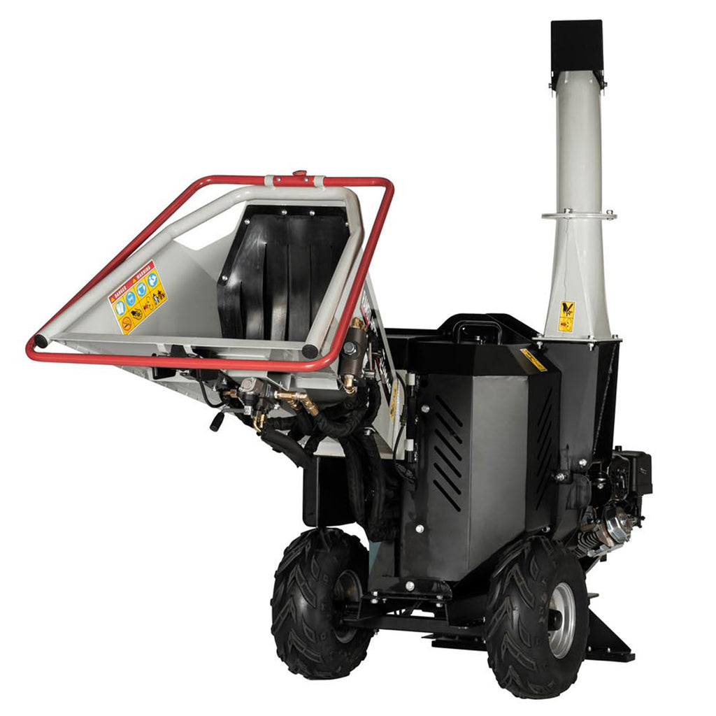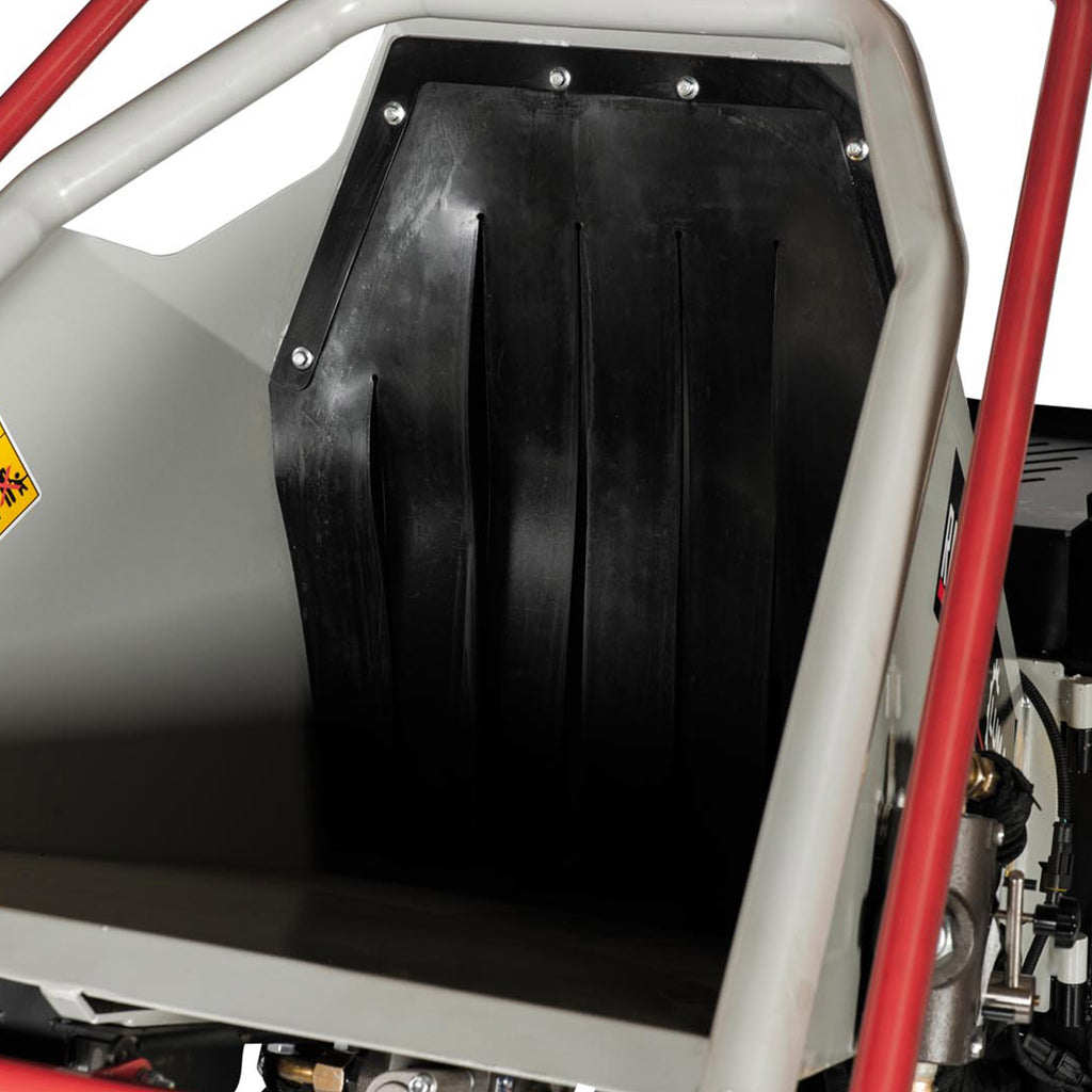 Rozdrobniony materiał wyrzucany jest przy pomocy rury obracanej w zakresie 360°. Lej wylotowy posiada regulację nachylenia wyrzutu. Z łatwością można ustawić go tak, by skierować materiał prosto do taczki, przyczepki czy innego pojemnika. Szerokie podwozie, zaczep kulowy i pneumatyczne koła umożliwiają transport, a noga podporowa zapewnia stabilność.
