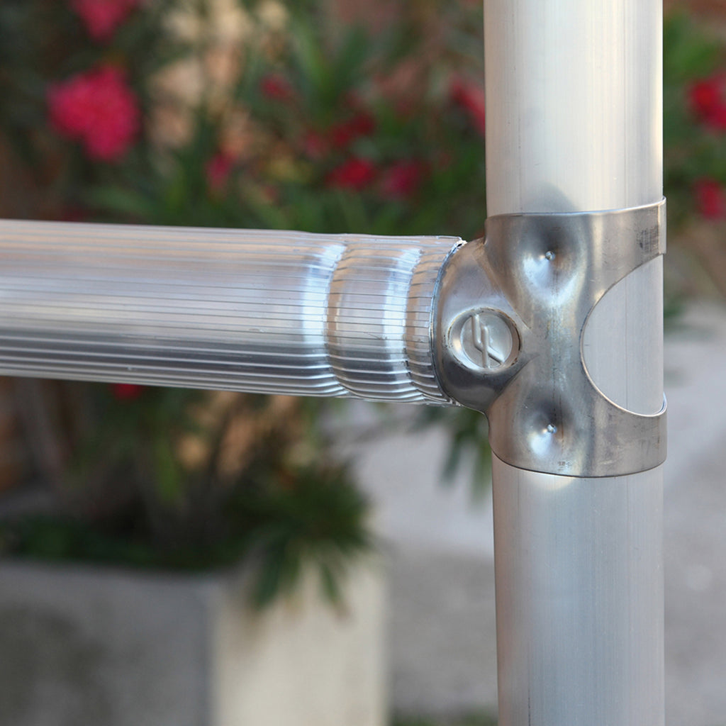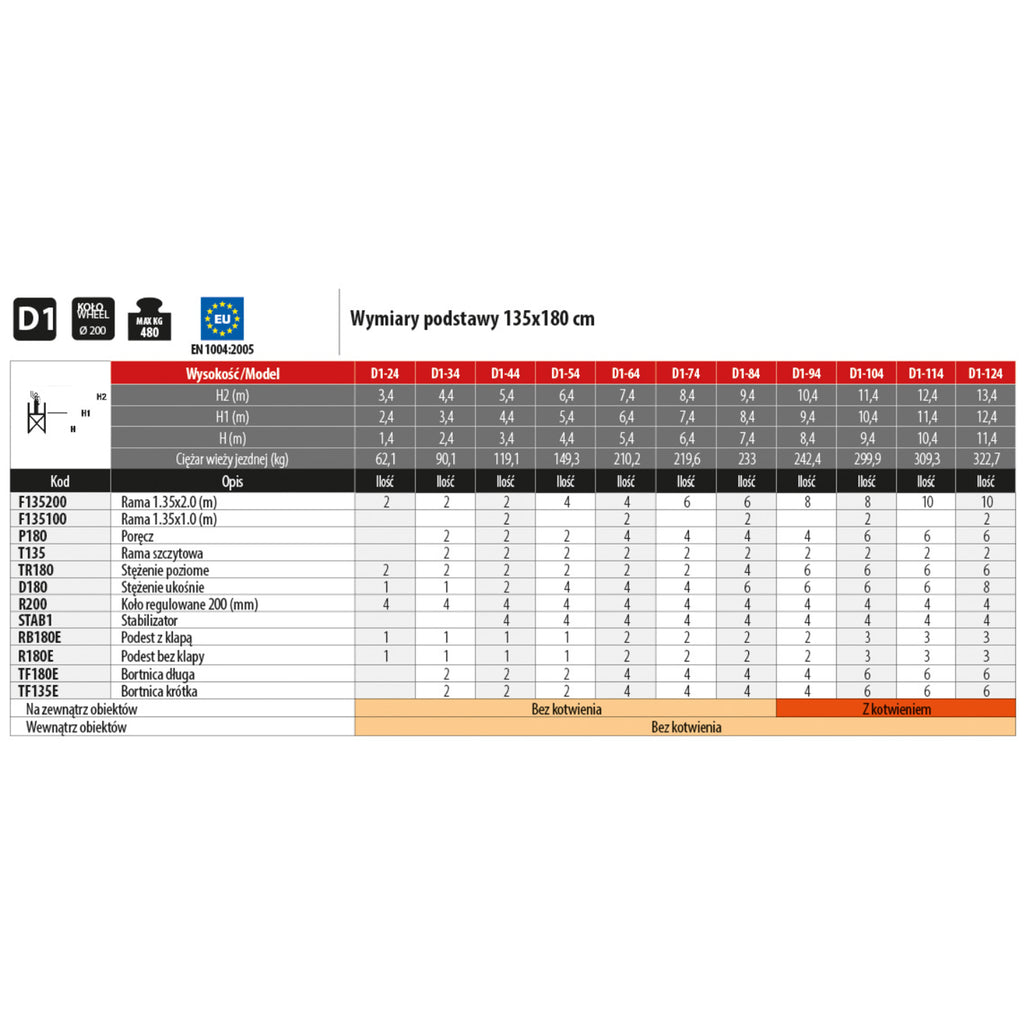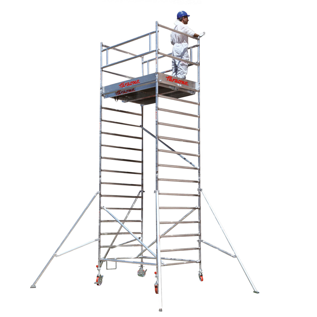 Aluminiowe rusztowanie jezdne Faraone TOP SYSTEM o wymiarach podstawy 1,35 m x 1,80 m oraz wysokości roboczej 9,4 m to wytrzymała wieża do pracy na wysokości przeznaczona głównie dla użytku profesjonalnego. Konstrukcje z tej serii występują w kilku wariantach wysokości, maksymalna wysokość robocza jaką można otrzymać to 13,4 m.