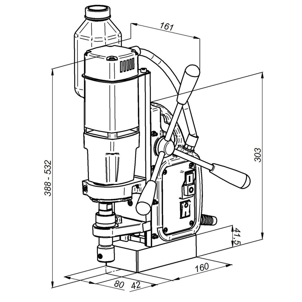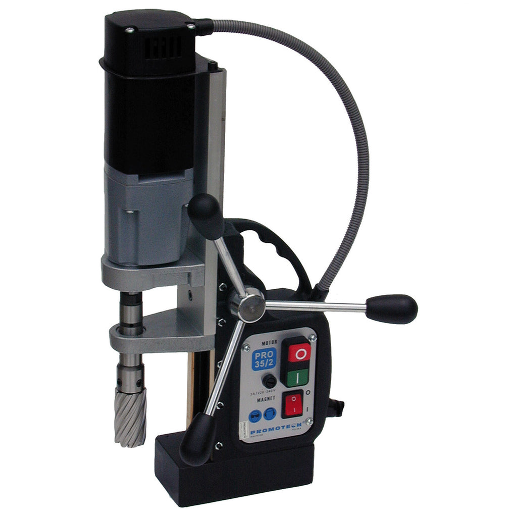 Wiertarka elektromagnetyczna PROMOTECH PRO 35/2 to niewielkie urządzenie, które doskonale sprawdzi się do pracy na wysokości czy w trudno dostępnych miejscach. Wykonuje otwory o średnicach do 35 mm - przy pełnym wykorzystaniu narzędzi (wyższa prędkość obrotowa dla wierteł krętych, niższa dla frezów trepanacyjnych). Wiertarka PROMOTECH wyposażona jest w 2-biegowy napęd o mocy 1,05 kW.