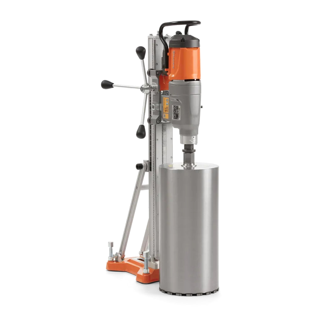 Wiertnica ma moc 3,2 kW, 3-biegową przekładnię oraz zalecaną średnicę wiertła 100–450 mm, co zapewnia optymalną wydajność wiercenia i dłuższe okresy międzyobsługowe. Zalecany jest statyw Husqvarna DS 500, szybkozłącze ułatwia połączenie ze statywem, a przyłącze wodne G ¼" (max 3 bar) wspiera wiercenie otworów odprowadzających wodę.