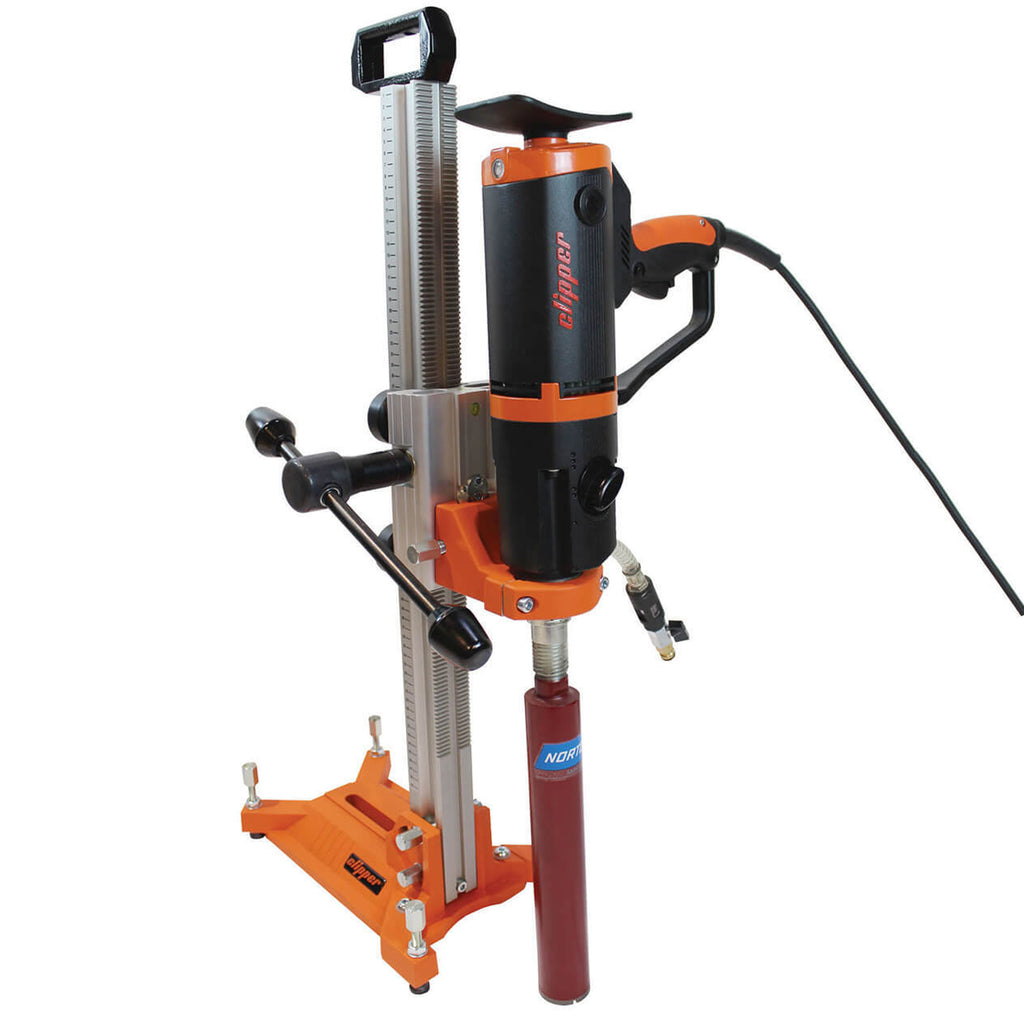 Zestaw do wiercenia betonu od marki Norton Clipper to sprzęt o dużej mocy, który poradzi sobie nawet z najtwardszym materiałem. Rolkowy układ prowadzenia wiertnicy sprawia, że operator nie musi wysilać się, aby sprawnie i płynnie operować wiertnicą. Ponadto trzystopniowa regulacja obrotów pozwala na dopasowanie prędkości do rodzaju obrabianego materiału.