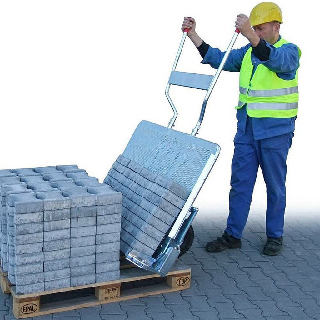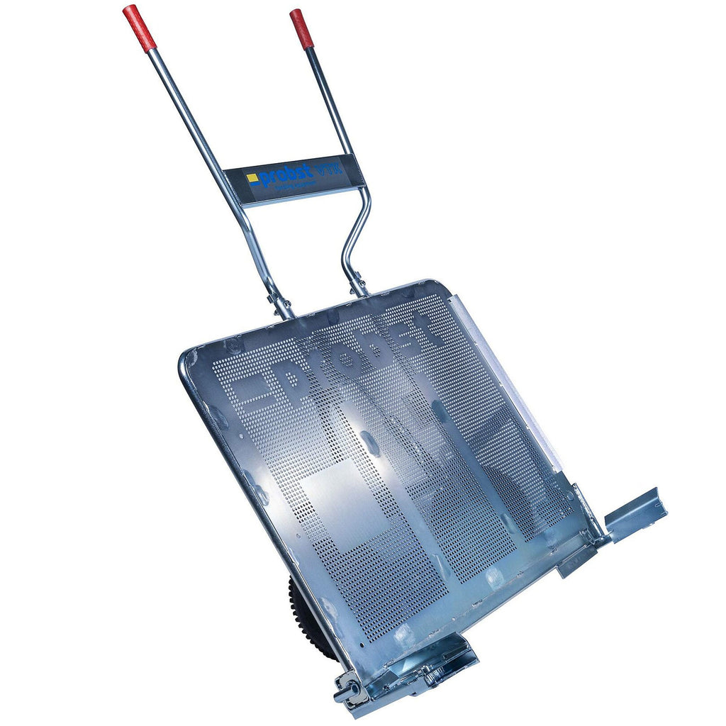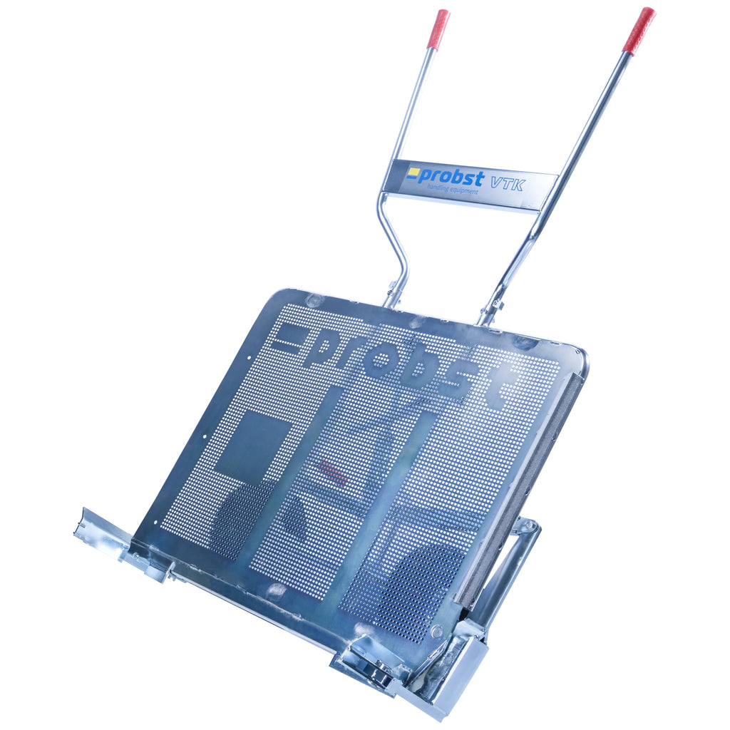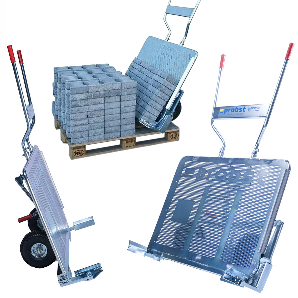 Wózek brukarski Probst VTK-V to w pełni mechaniczne, niezawodne urządzenie do bezwysiłkowego transportu różnego rodzaju płyt, kostek brukowych czy krawężników. Pozwala na przewiezienie luźnych elementów, jak i tych związanych. Ten regulowany wózek do kostki VTK-V to model wyposażony w specjalne chwyty, umożliwiające dopasowanie zacisku w zakresie 550-1050 mm. Chwytanie odbywa się za pomocą dźwigni 90°, gdzie maksymalny nacisk to 15 kg. Jednak limit obciążenia roboczego wynosi 400 kg.