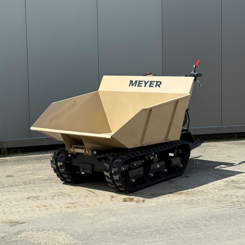 MEYER T1000WL to kompaktowe wozidło gąsienicowe o ładowności 1000 kg, idealne do transportu materiałów w trudnym terenie. Napędzany silnikiem Loncin G420F (15 KM), posiada przeprojektowaną skrzynię ładunkową ułatwiającą wysypywanie urobku.